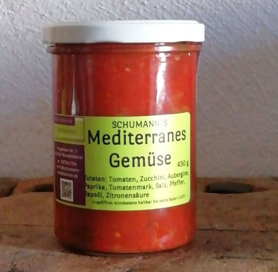 Zutaten: Tomaten, Zucchini, Aubergine, Paprika, Tomatenmark, Salz, Pfeffer, Rapsöl, Zitronensäure