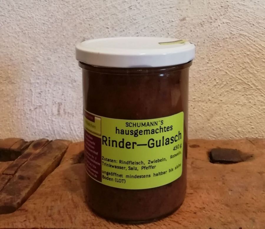 Zutaten: Rindfleisch, Zwiebeln, Rotwein (enthält Sulfite), Trinkwasser, Salz, Pfeffer